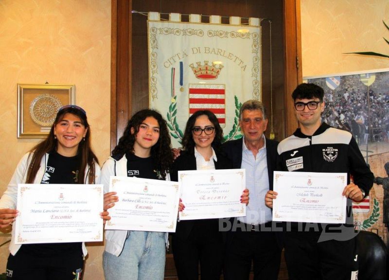 A riceverli sono stati Michele Paolicelli, vincitore del campionato di pugilato olimpico, categoria pesi massimi Under 19 ASD Gladiatorgym di Barletta; Maria Lanciano della Lega navale Italiana Sezione di Barletta per l’ottimo quarto posto nella competizione mondiale della specialità Beach Sprint e la medaglia d’oro sia agli europei che ai campionati italiani; Barbara Cilli, Sempre della Lega Navale, Bronzo nel doppio under 19 e oro ai Campionati italiani; Teresa Doronzo che ha ottenuto il merito accademico internazionale per Erasmus Bip per il dottorato di ricerca nel Methodo Reapses (approccio pedagogico e socio educativo) che, tra l’altro ha presentato due libri su Ettore Fieramosca e Giuseppe De Nittis; Federica Fiorella che ha recentemente ottenuto il ”Premio America Giovani”, il prestigioso riconoscimento conferito dalla Fondazione Italia USA ai neolaureati delle università italiane che si sono distinti per merito accademico e qualità del percorso di studi.