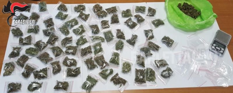 Il secondo arresto si è verificato in zona Patalini dove i Carabinieri, unitamente alle unità cinofile antidroga, hanno effettuato una perquisizione presso l’abitazione di un giovane già noto per precedenti specifici. L’operazione aveva esito positivo poiché il fiuto dei cani permetteva di rinvenire ben 210 grammi di marijuana, di cui buona parte già suddivisa in bustine, pronte per essere commercializzate nelle piazze di spaccio. Sempre nell’abitazione veniva inoltre rinvenuto tutto il materiale per il confezionamento tra cui un bilancino di precisione. Anche per questo giovane dell’età di 23anni, su disposizione della competente A.G., si sono aperte le porte della Casa Circondariale di Trani.